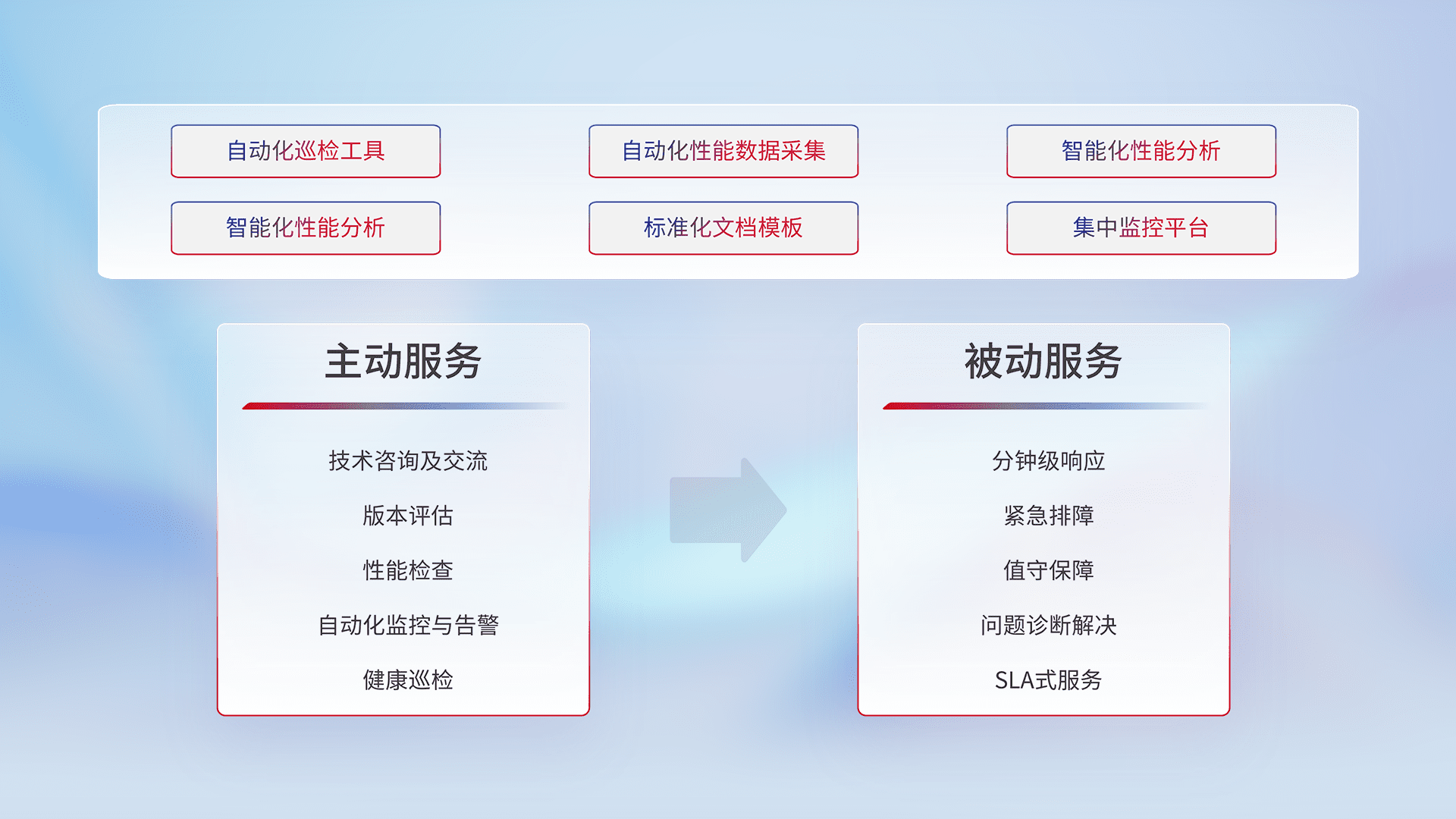 智能化工具和标准化文档,,,,保障服务质量,,提供主动服务(包含技术咨询、、版本评估、、、性能检查、、、自动化监控与告警、、健康巡检)和被动服务包含(分钟级响应、、、、紧急排障、、值守保障、、、问题诊断解决、、SLA服务)。。